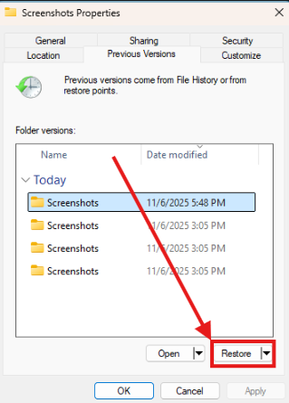 3. In the Previous Versions tab, you will see a list of all the backups of that folder, select the backup you want to restore from, then click restore: