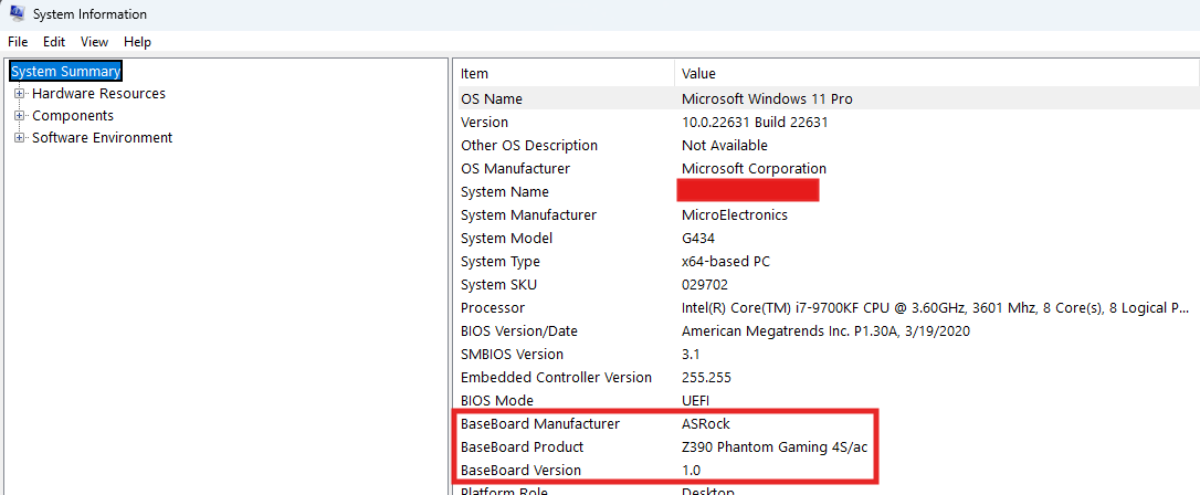 The system summery that opens up will show a lot of information about your computer, however, most of the important drivers we may need for troubleshooting will be for the motherboard. Locate Baseboard Manufacture and Product in the summary and make a note of the information. Note: these steps are for the motherboard, but if your looking for the video drivers, you may check Components > Display to see what card is listed.