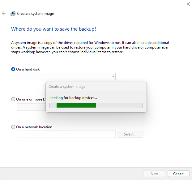 - Your computer will look for backup devices, this may take a couple of minuets: