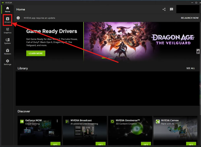 Once you have the Nvidia App open, you want to click on the drivers option on the left side of the app: