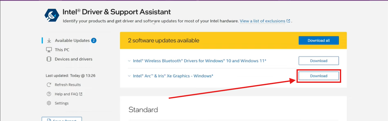 1. Once you have the Intel Driver & Support Assistant open, you may be greeted by a few options, for the purposes of this guide, we are going to click the Download button next to Intel Arc & Iris Xe graphics - Windows: