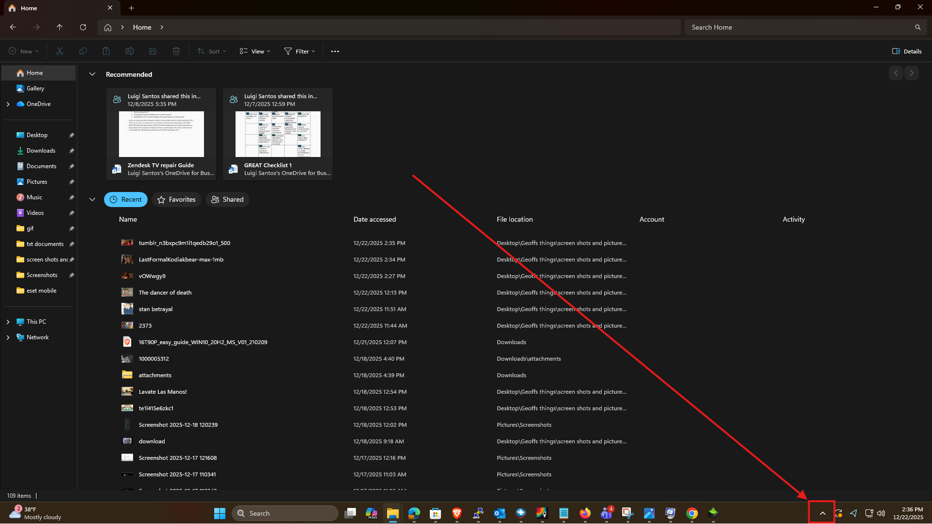 1. Once you have the software installed, or if you Already have the Intel Driver & Support Assistant, you can find it in the Hidden Icons arrow ^ found on your taskbar at the bottom right of the screen to the left of the time and date: